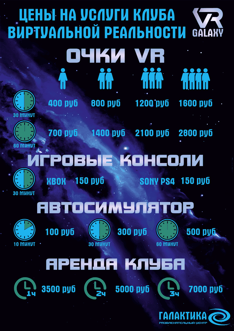 Провести день Рождения ребенка, взрослого или весело провести время компанией можно в клубе Виртуальной реальности VR Galaxy. Выкуп клуба VR Galaxy от 2500₸/час